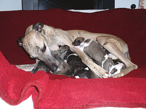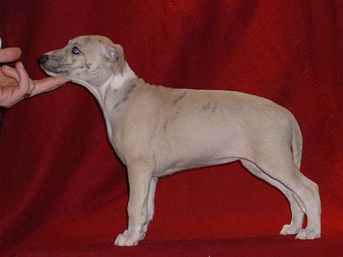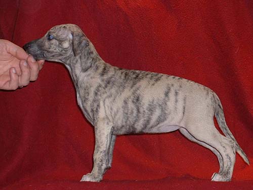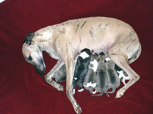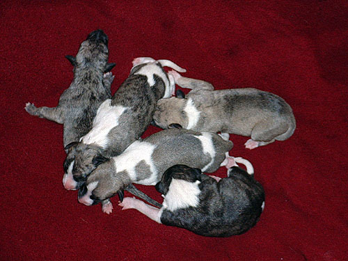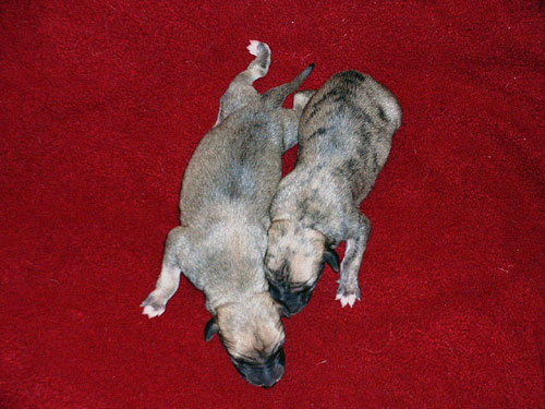 Bei dieser Verpaarung handelt es sich um einen Outcross. Die Mutter vereinigt vorzügliche, vor allem englische, aber auch amerikanische Blutlinien. Der Vater vor allem amerikanische,wobei er aber dem englischen Standard in jeder Hinsicht, auch was die Größe angeht, voll entspricht. Die Geburt war, trotz stattlicher Größe der Welpen, vollkommen problemlos. Das, was bei den Babys auf den Fotos mausgrau erscheint, wird sich in absehbarer Zeit in ein helles beige mit schwarzer Stromung verwandeln. Die Namen der Welpen rekrutieren sich diesmal aus Musical-Titeln. Wir freuen uns ...!!!
