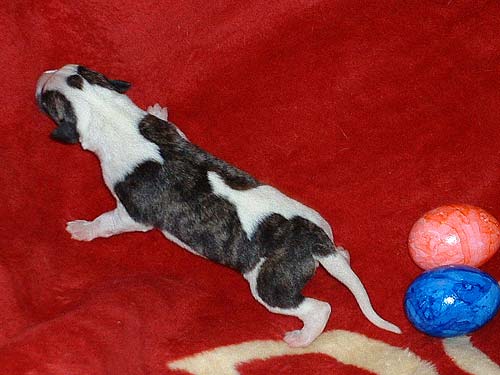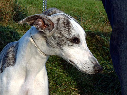 Ganz im Gegensatz zu ihren Brüdern aus dem L-Wurf, handelt es sich bei dieser einzigen Hündin aus dem Wurf um eine sehr zarte und feminine Hündin, die sich im Gegensatz zum allgemeinen Trend eher am unteren Rand der vom Standard angegebenen Größenbeschränkung bewegt, was ja wahrlich kein Nachteil ist. -Daher ihr Rufname "Twiggy"! Aus unserer Sicht ist sie eine vielversprechende Hündin, ihr rasantes Wesen ist kaum zu übertreffen.